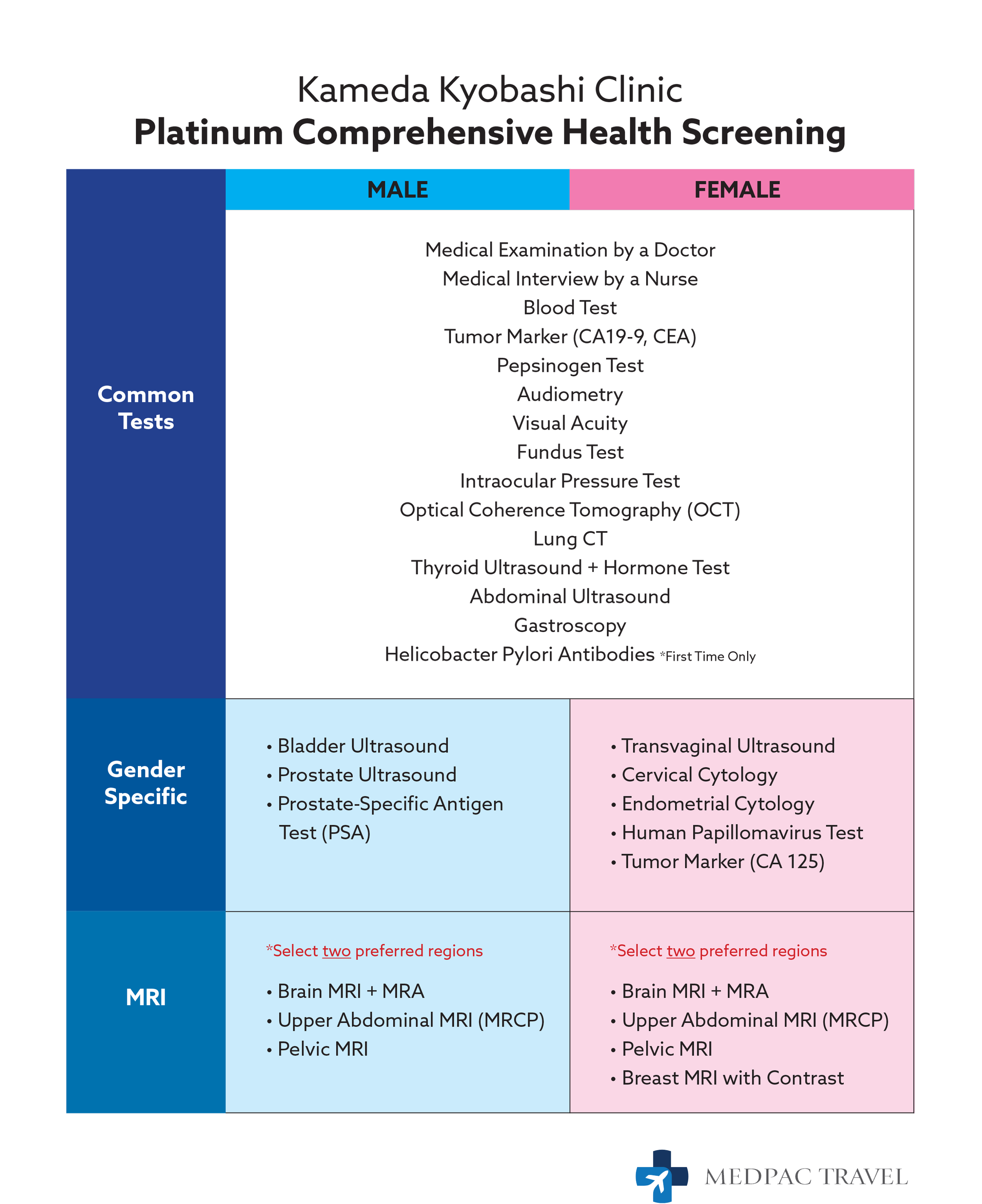 • Packages include the Platinum Comprehensive Health Screening at Kameda Kyobashi Clinic Tokyo